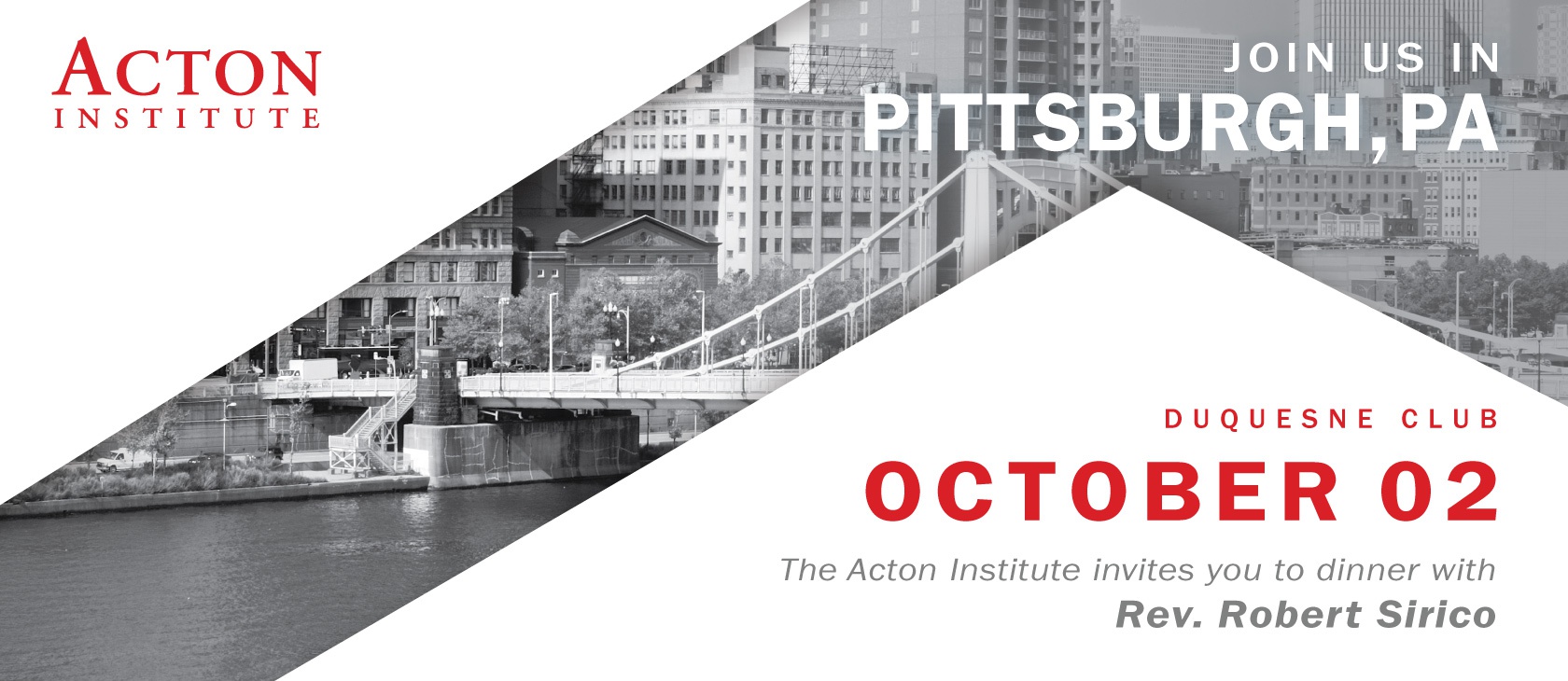 Please join Rev. Robert A. Sirico, co-founder and president of Acton Institute, and other supporters and friends of Acton on the evening of Tuesday, October 2 at the Duquesne Club in picturesque downtown Pittsburgh, for a cocktail reception followed by dinner and a special keynote address. Register now to save your spot at this popular event.