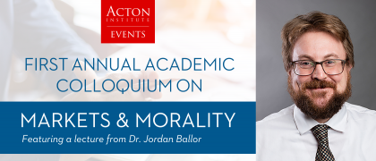 Page 13 of 46 October 8, 2021 10:30am First Annual Academic Colloquium on Markets & Morality What hath Kuyper to do with Keynes? Bavinck to do with Böhm-Bawerk? If these are questions that interest you, then look no further than the Read more » October 7, 2021 5:30pm 2021 Pittsburgh Dinner featuring Rev. Robert A. Sirico Please join Rev. Robert A. Sirico, co-founder and president of Acton Institute as well as supporters and friends of Acton on Thursday Read more » October 6, 2021 4:00pm Open House: The Great Works at the Acton Institute Join the Acton Institute for an open house on Oct. 6 from 4pm-8pm for an open house to see many curated works from The Remnant Trust, a Read more » September 23, 2021 12:00pm Lecture series Time Machines from the Past: Old Books are Still Cool We are excited for a return to in-person for the Acton Lecture Series! Books connect us in a very real way to people and ideas from the past Read more » September 9, 2021 4:00pm Conference series Religion, Liberty, and American Culture - A Graduate Student Colloquium Co-sponsored by Liberty Fund, Inc., this is an intellectually demanding and stimulating weekend colloquium that explores the foundations of Read more » August 19, 2021 12:00pm Lecture series What It Means to Be Human The natural limits of the human body make us vulnerable and therefore dependent on others. Yet American law and policy disregard these Read more » July 22, 2021 12:00pm Lecture series Men Without Work For over half a century America has been suffering from a growing but strangely overlooked crisis: a flight from work by men in the prime of Read more » June 23, 2021 12:00pm Conference series Acton University Online 2021 Acton University Online is not your typical digital conference. It’s a unique, two-day, live & interactive experience exploring the Read more » May 27, 2021 12:00pm Lecture series The Rise and Triumph of the Modern Self Modern culture is obsessed with identity. Since the landmark Obergefell v. Hodges Supreme Court decision in 2015, sexual identity has Read more » April 29, 2021 12:00pm Lecture series Solzhenitsyn against Propaganda Too loosely is the word "Marxist" used to insult a conflicting viewpoint. When we conscript people to a "side" and reduce them with a label Read more » Pagination First page « First Previous page ‹ Previous … Page 9 Page 10 Page 11 Page 12 Current page 13 Page 14 Page 15 Page 16 Page 17 … Next page Next › Last page Last »