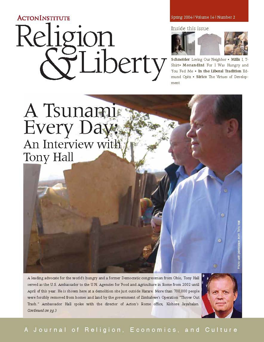 In This Issue A Tsunami Every Day: An Interview with Tony Hall Doubled-edged sword: The power of the Word Editor's note Edmund A. Opitz For I was hungry and you fed Me: Ag-biotech and hunger I've seen advertisements for Acton University. Is this conference going to replace the Toward a Free and Virtuous Society conferences? I, T-shirt: Lessons from the cotton industry Loving our neighbor - near and far The Right To Be Wrong: Ending the Culture War over Religion in America The virtues of development Get This Issue Download as PDF Recent Issues Fall 2025 Volume 35 Number 4 Summer 2025 Volume 35 Number 3 Spring 2025 Volume 35 Number 2 Winter 2025 Volume 35, Number 1 Fall 2024 Volume 34, Number 4 Summer 2024 Volume 34, Number 3
