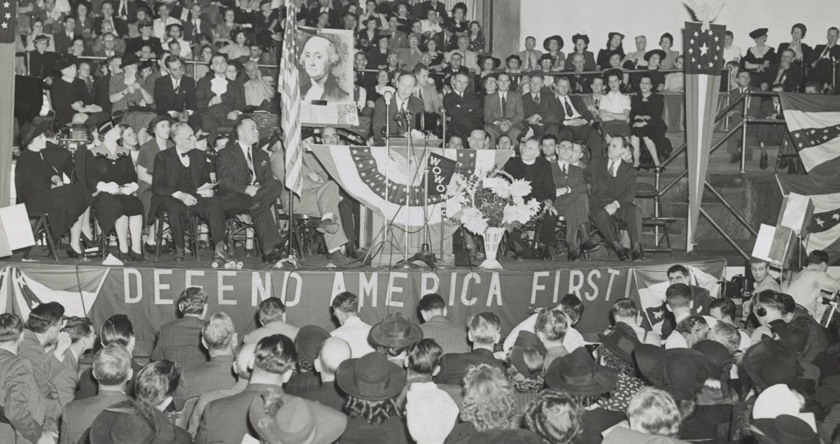 American fascists like William Dudley Pelley and his Silver Legion of America (or “the silver shirts”), though small in number, endorsed fascism directly and opposed American intervention on the side of the Allies, as did the much more popular Fr. Charles Coughlin, a Canadian-born Catholic radio priest based out of Detroit, publisher of the magazine Social Justice, and leader of the antisemitic and fascist party the Christian Front, which had been infiltrated by Nazi agents. Fascist sympathizers like Charles Lindbergh promoted anti-interventionism as part of his “America First” appeal, which garnered significant support. All three identified American intervention on the side of the Allies as a Jewish plot and therefore built into their defense of fascism a conspiracy theory of European origins for an American audience.