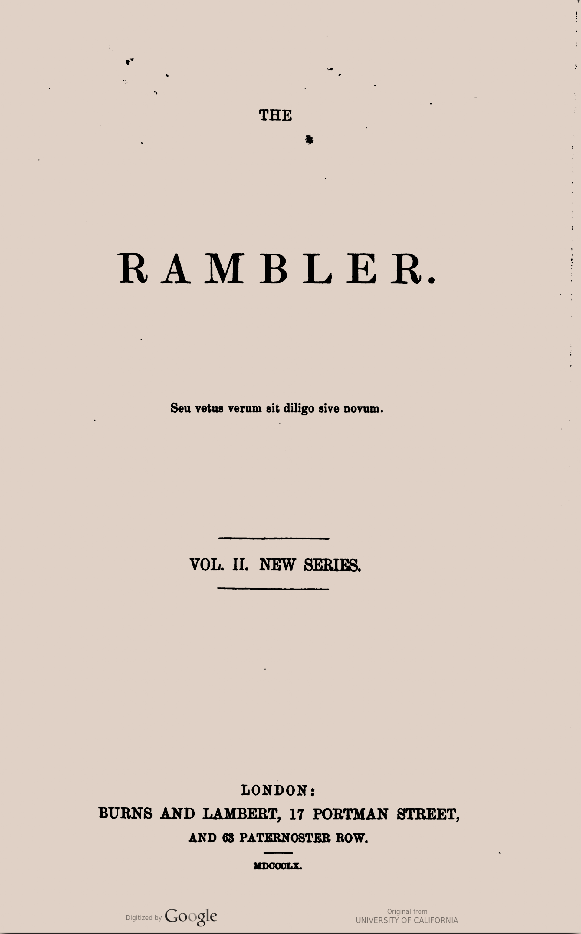 The Rambler was commenced on 1st of January 1848 as a weekly magazine of home and foreign literature, politics, science and art. Its aim was to unite an intelligent and hearty acceptance of Catholic dogma with free enquiry and discussion on questions which the Church left open to debate and while avoiding, as far as possible, the domain of technical theology, to provide a medium for the expression of independent opinion on subjects of the day, whether interesting to the general public or especially affecting Catholics.