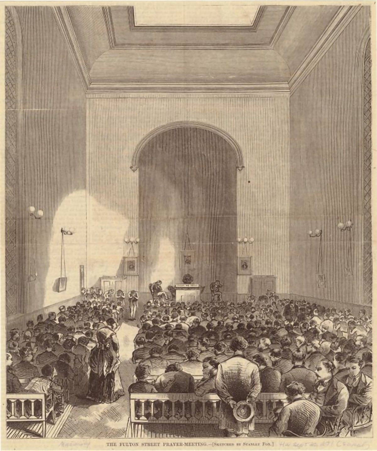 Another significant religious renascence was the “Businessman’s Revival” of 1857–58 in New York City. Jeremiah Lanphier, a lay minister with the North Dutch Reformed Church, initiated a small prayer group for businessmen. While starting modestly, his noontime prayer vigils in and around New York swelled to tens of thousands within just two months. Most historians link the stock market panic of 1857 as a significant social instigator for this revival, which eventually spread throughout the nation.