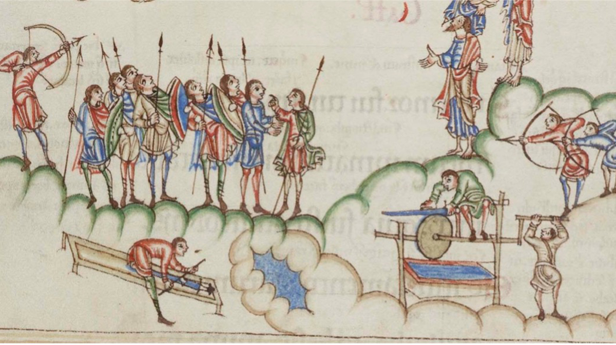 A ninth-century illuminated manuscript known as the Utrecht Psalter is an early example of technology and religion intersecting. The Psalter’s illustration of Psalm 64:2–3—“Hide me from the secret plots of the wicked, from the throng of evildoers, who whet their tongues like swords, who aim bitter words like arrows”—depicts God’s people sharpening their swords on a newly developed technology, the grindstone, while evildoers rely on the old-fashioned technology of the whetstone. God was on the side of new technologies and progress. As the Utrecht Psalter made its way around medieval Europe, religious communities bought into the idea that technological progress was God-ordained and a means of either restoring Eden or, at the very least, ushering in a new age.